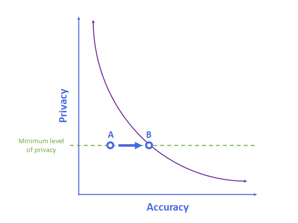 In other words, MELLODDY is trying to move from point A, where they are now, to point B, which is on the accuracy and privacy frontier. At this point they would be maximizing the accuracy of their algorithm given a certain minimum level of privacy.